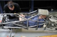 De kleur oranje moet onderstrepen dat we als Nederland ten strijde gaan naar het record dat in Amerikaanse handen is. Als startnummer dient voorlopig nog het oude bekende nummer van Aalt, maar dat zal later natuurlijk het officiële startnummer worden. Inmiddels is de bouw al ver gevorderd zoals we hieronder kunnen zien. Aalt zit al op z’n plekje terwijl Gerrit de ophanging van het stuur op de juiste plaats aanbrengt. Maarten heeft een prachtige naafbesturing bedacht waarvan later nog wat detailfoto’s zullen volgen.