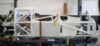 Nadat alle polyester delen op hun plek zaten zijn ze er snel weer afgehaald om te spuiten . Daarna moesten nog een aantal punten aangepakt worden, zoals het maken van een kast om het voorwiel zodat Aalt geen last krijgt van opstuivend zout en zodat we voldoen aan de veiligheidseisen ingeval van een klapband. Na nog wat kleine laswerkzaamheden is alles gedemonteerd en is het frame gespoten. In de loop van komende week zal alles weer gemonteerd worden en zal de Groene Tulp op een echte “Streamliner” beginnen te lijken. Hieronder het pas gespoten frame dat enkel bestaat uit de voorgeschreven “kooi” met dubbele “roll bar” voor de bestuurder en aan de voor- en achterkant de bevestiging voor een neus en staart welke wel een zo licht mogelijke constructie hebben.