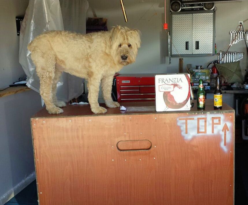 Hierboven een foto van het krat in de garage van Aalt Doldersum in LA. Aalt heeft meteen de nodige veiligheidsmaatregelen getroffen en zijn waakhond er op gezet.